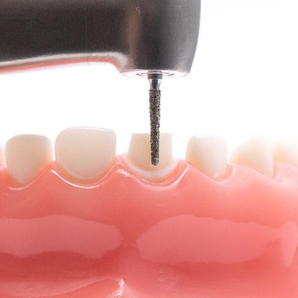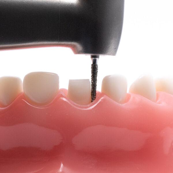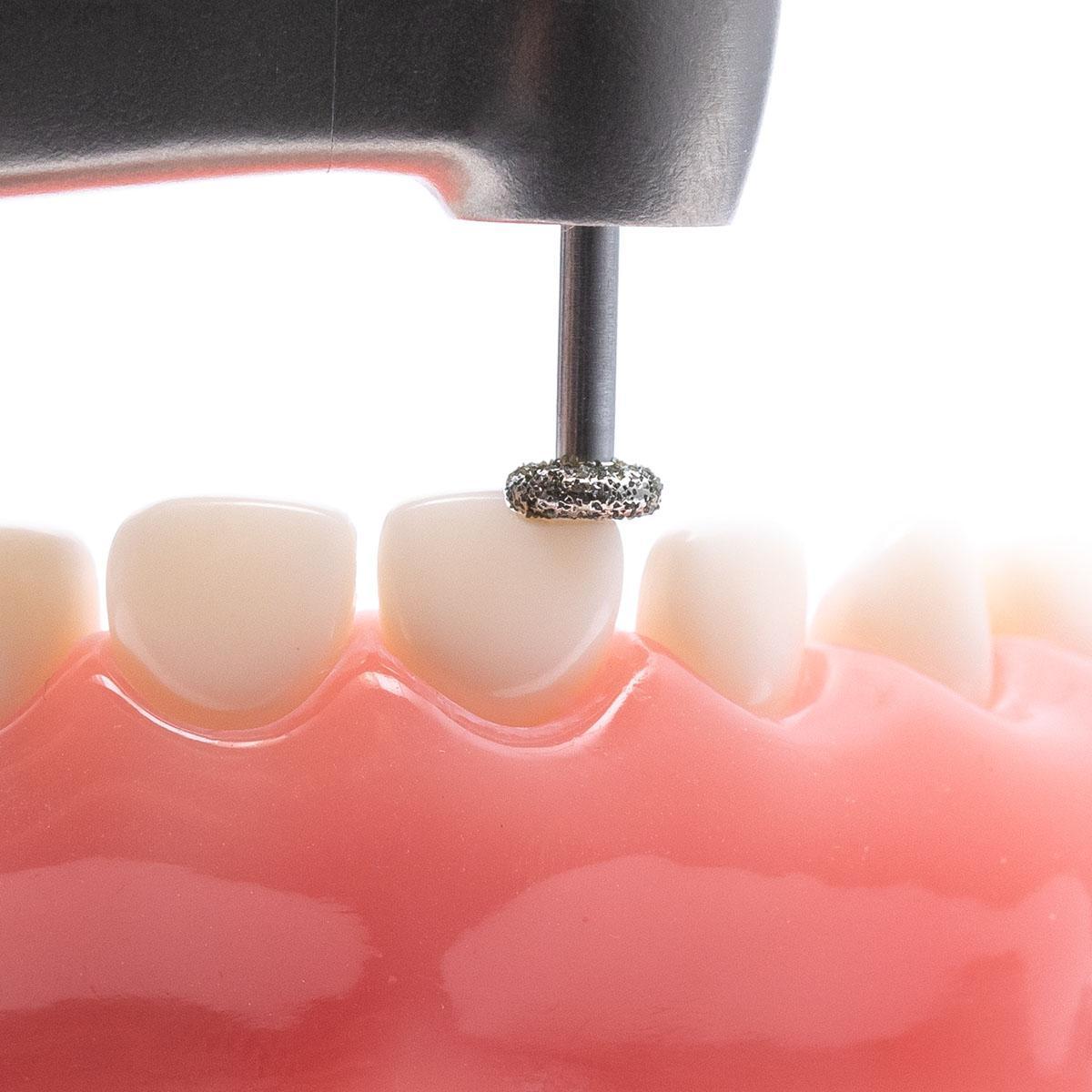 - The ‘football’ design of the bur allows you to quickly reduce the cingulum into a concave shape.